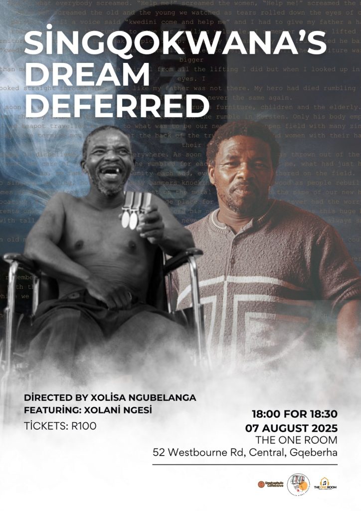 Singqokwana’s Dream Deferred: a play about a man who became politically active after being wrongfully arrested during the 1952 Defiance Campaign in New Brighton, Gqeberha, spending six weeks at North End Prison, popularly known as Rooi Hell because of misidentification by police, who were looking for a neighbor. In 1962, he left South Africa for military training in Ethiopia. He was arrested in Rhodesia enroute back to South Africa in January 1963 and was detained alongside Nelson Mandela in Robben