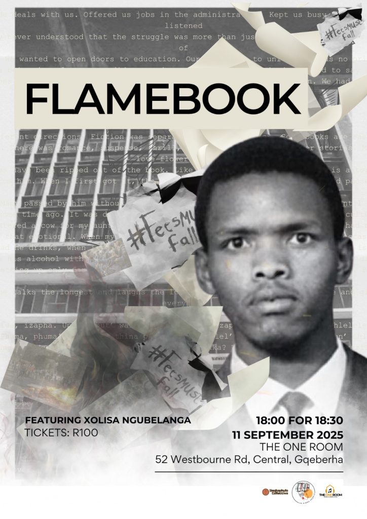 Flamebook: Fire, capable of both disaster and cleansing, has proved to be the oppressed people’s weapon of choice during protest and has become characteristic of the South African struggle. A detained student leader uses fire to connect the trials of FeesMustFall with that of his father during the state of emergency. The student details an ordeal where he had to set a university building alight during their protest while reminiscing on his father’s anguish as he sat in prison with his teeth broken during an assault by the police after being arrested at a road block during Biko’s detention. September 1977, Steve Biko was detained in Port Elizabeth, leading to his death and funeral in King Williams Town. During Biko’s funeral, it is said that thousands of people were turned away at roadblocks